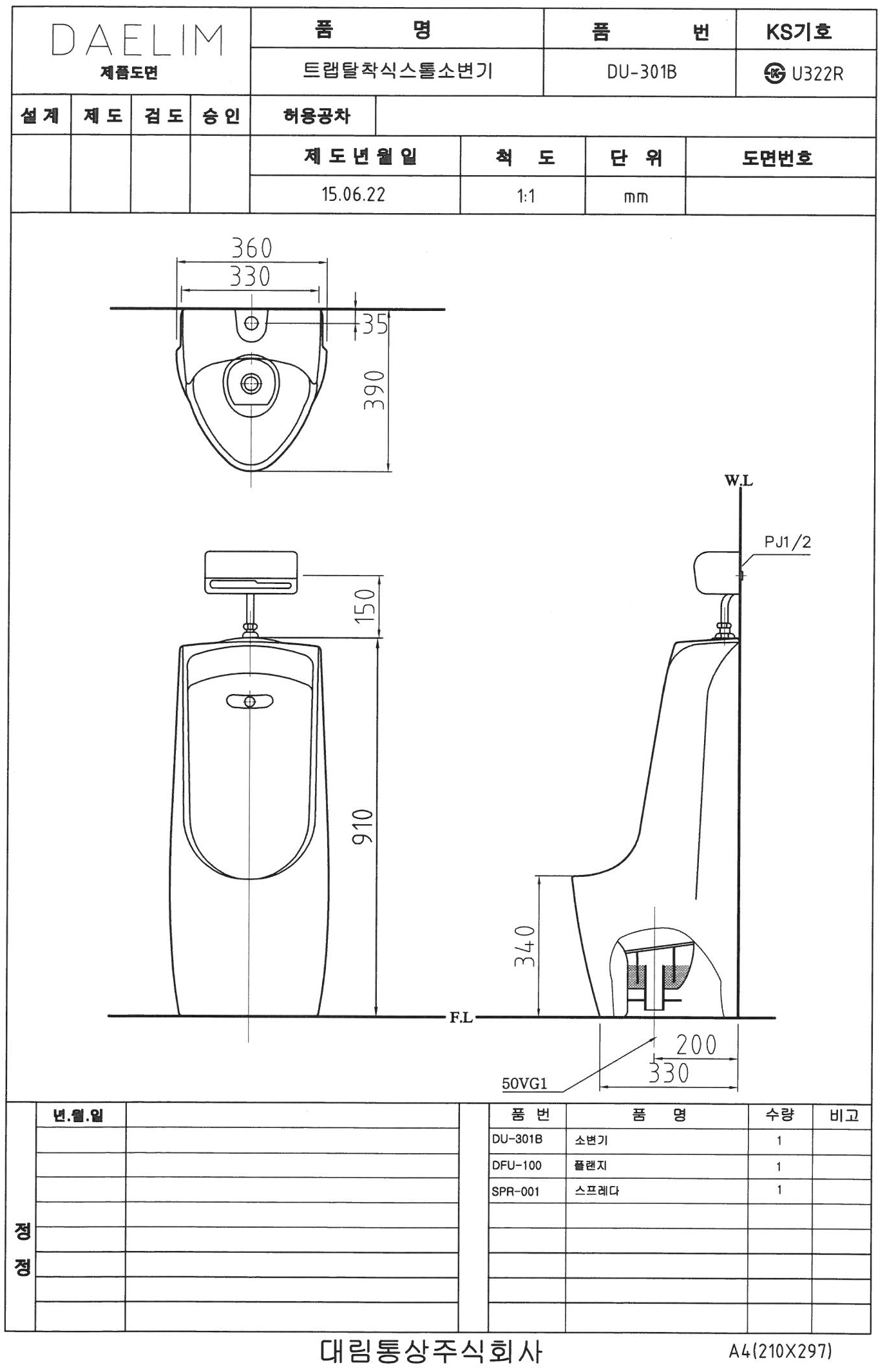 MODEL 대림 도비도스 DU301 DU-301 트랩 탈착식 스톨 소변기 (센서, 세척밸브, 급수호스 미포함)